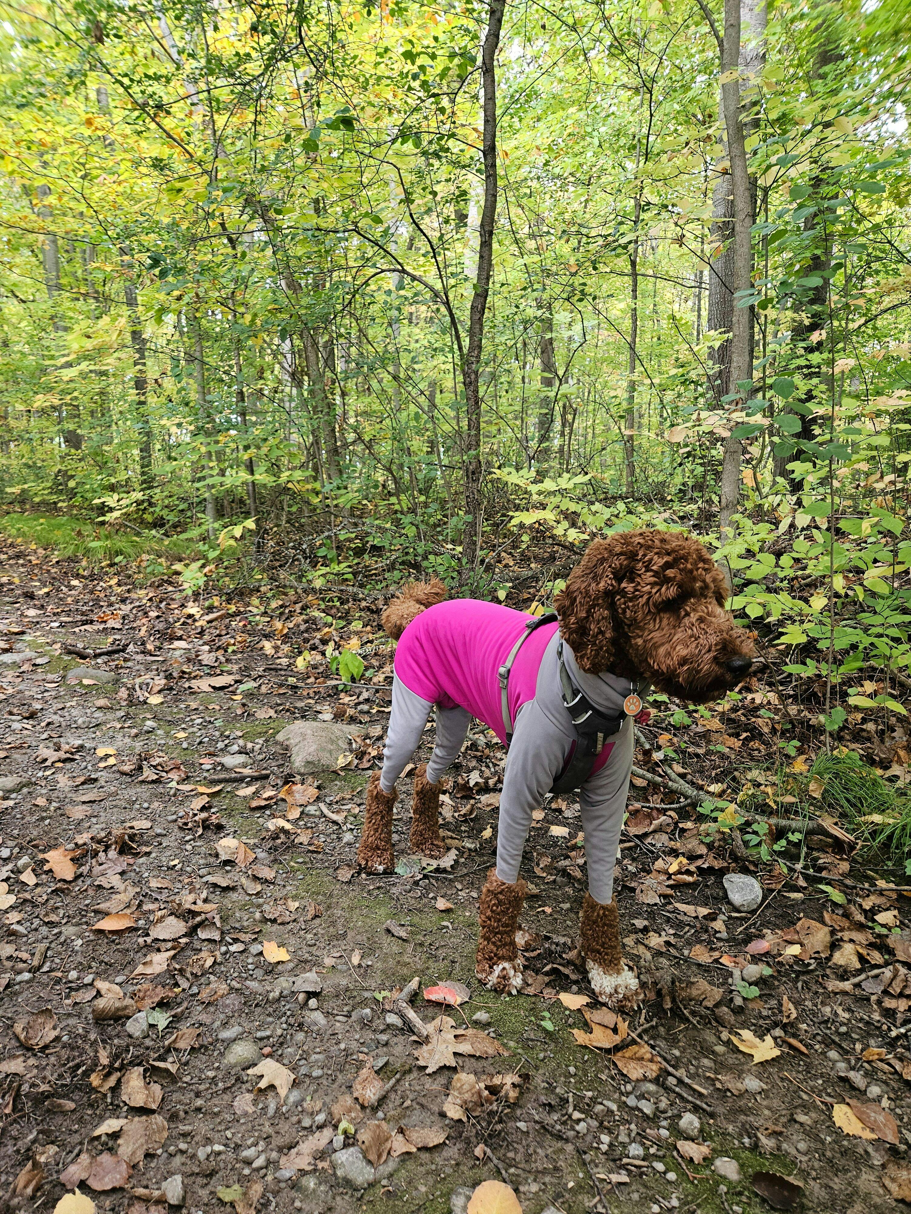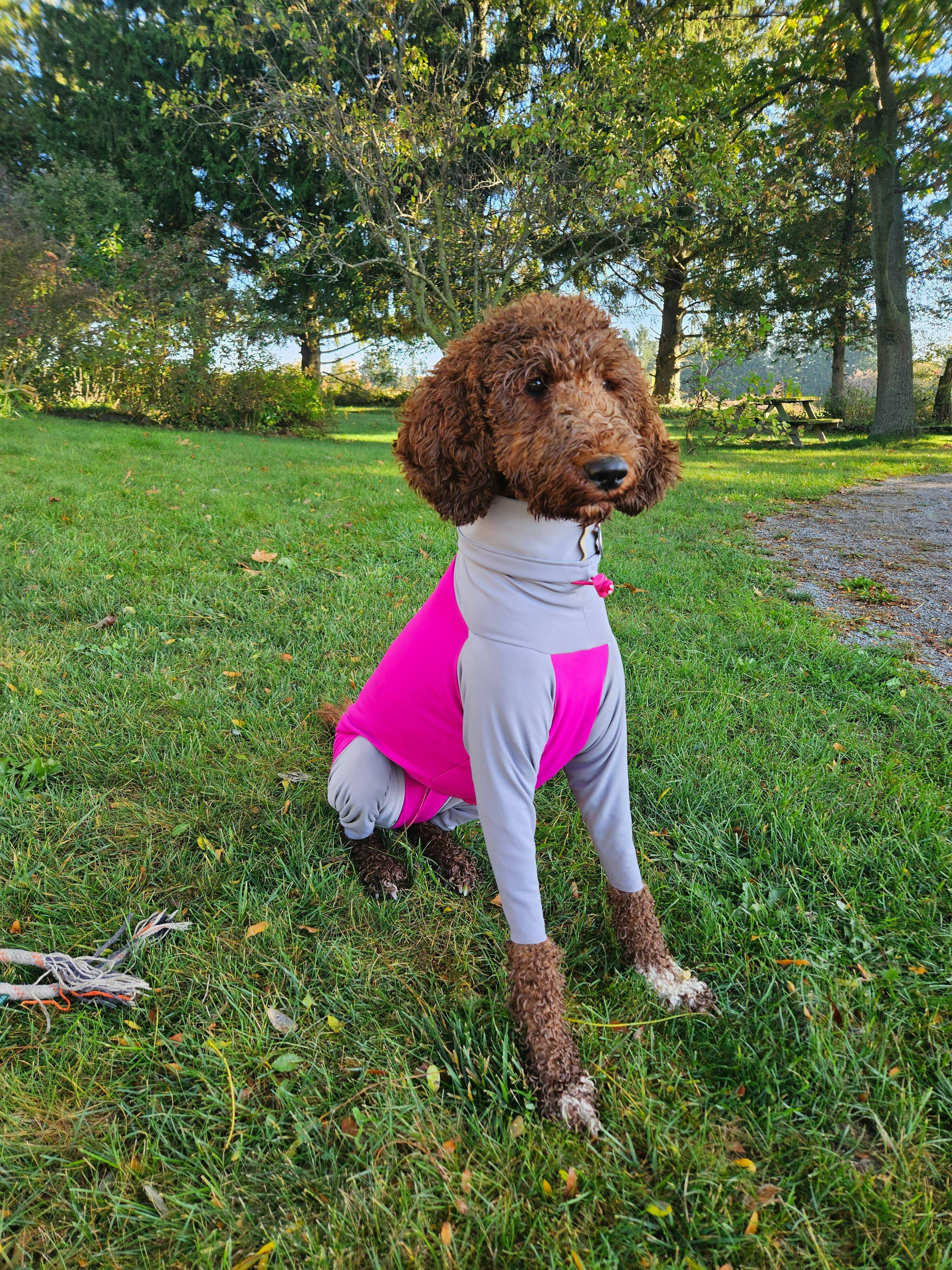 Includes a snood with an elastic drawstring to cover your dog’s ears and neck for maximum protection from the sun. The belly/chest is complete with a zipper for entry and exit. Note: This item zips right from the chest to the tail for females and right to the back legs for males so, it will need to be unzipped a bit for your dog to pee and poop. They fit very snug to minimize any snagging and are great for protecting sensitive skin from the direct sun, keeping ticks off of the majority of the body, protecting sutures or wounds, keeping the dog hair out of your back vehicle, keeping your dog clean from the feet up, keeping environmental allergens off...and always good for a giggle.